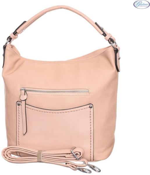 Dudlin púder nagy méretű női táska. 1 cipzáras rekesszel rendelkezik. Belsejében 1 kis cipzáras zseb és 2 kis zseb kapott helyet. Kívül az elején 1 zseb és 1 cipzáros zseb, a hátulján 1 cipzáras zseb található. Tartozik hozzá egy állítható hosszúságú, rácsatolható vállpánt is.