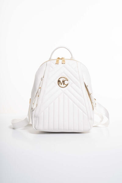 Steppelt műbőr hátitáska cippzáras zsebekkel, fém márkajelzéssel, állítható pánttal.